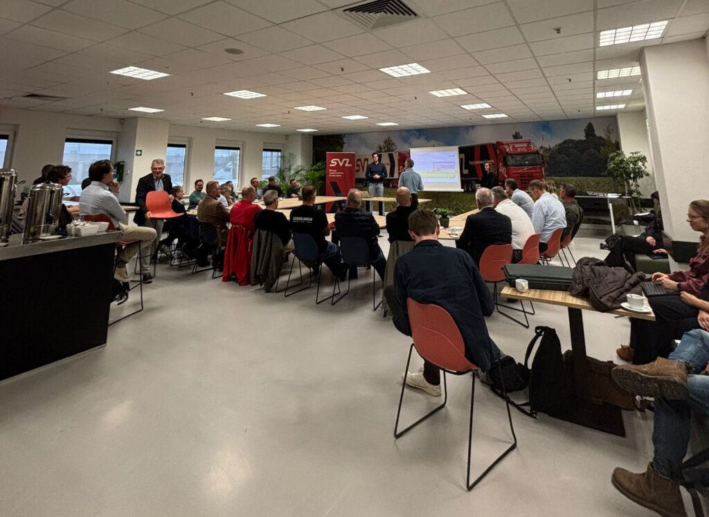 Michel Cornelis (SVZ Transport), gastheer van de bijeenkomst, laat zien dat verduurzamen binnen de sector wél kan, maar stap voor stap. Het bedrijf beschikt over 14 locaties, 34 standplaatsen en 1.300 vrachtwagens. In 2007 rijdt de eerste elektrische truck, inmiddels zijn het er veel meer.